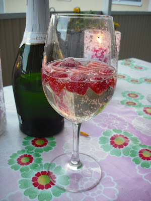 med bubbeldricka i.. toppat med svenska jordgubbar.